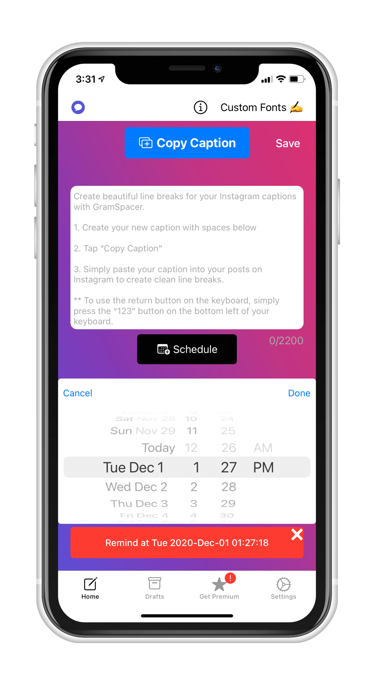 Once you finish your text, simply tap the “Copy Caption” button + paste it where you want